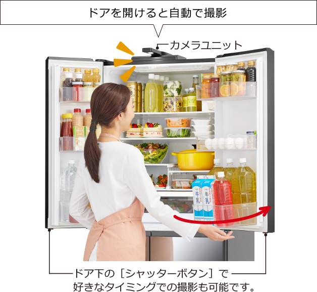 上部にカメラがついており、ドアを開けると自動で庫内を撮影。あの食材あったっけ?って時にスマホでチェックできてしまう便利な機能が新登場!(自分のタイミングでの撮影も可)