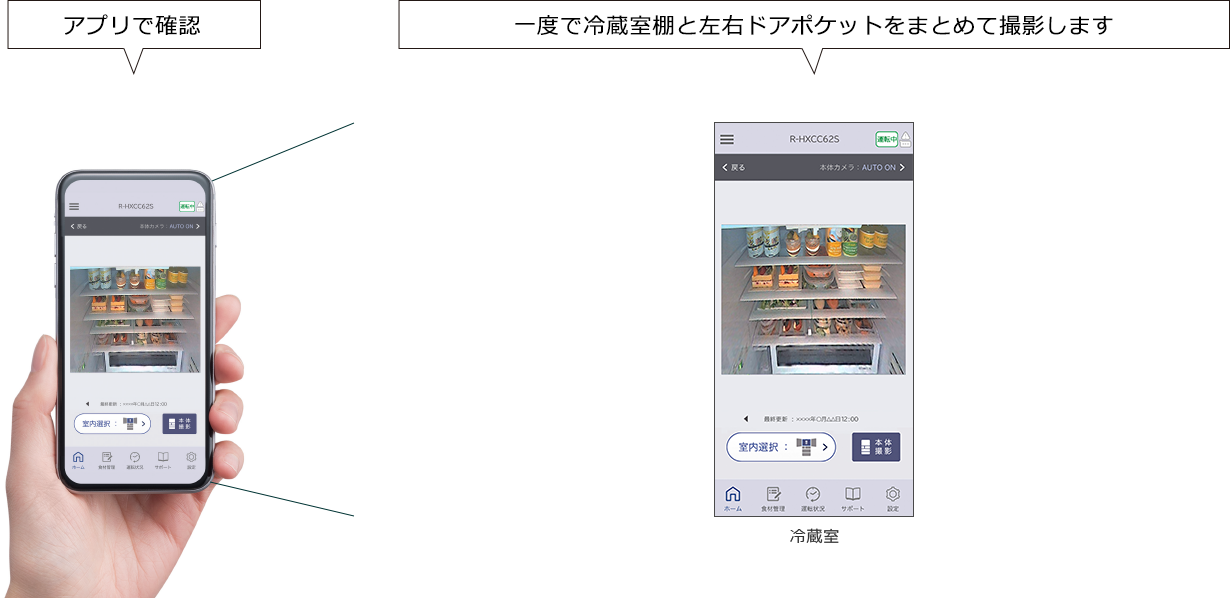 特鮮氷温ルーム内、冷蔵室内の奥側、大型ドアポケットの奥側は写らないので対策として、冷蔵室の場合、管理したい食品は手前に置く。ドアポケットの場合は、背の低い食品は手前に、背の高い食品は奥に置くと見やすくなる。(Android6.0以上、iOS10.0以降に対応。インターネット接続環境と無線LANルーターが必要)